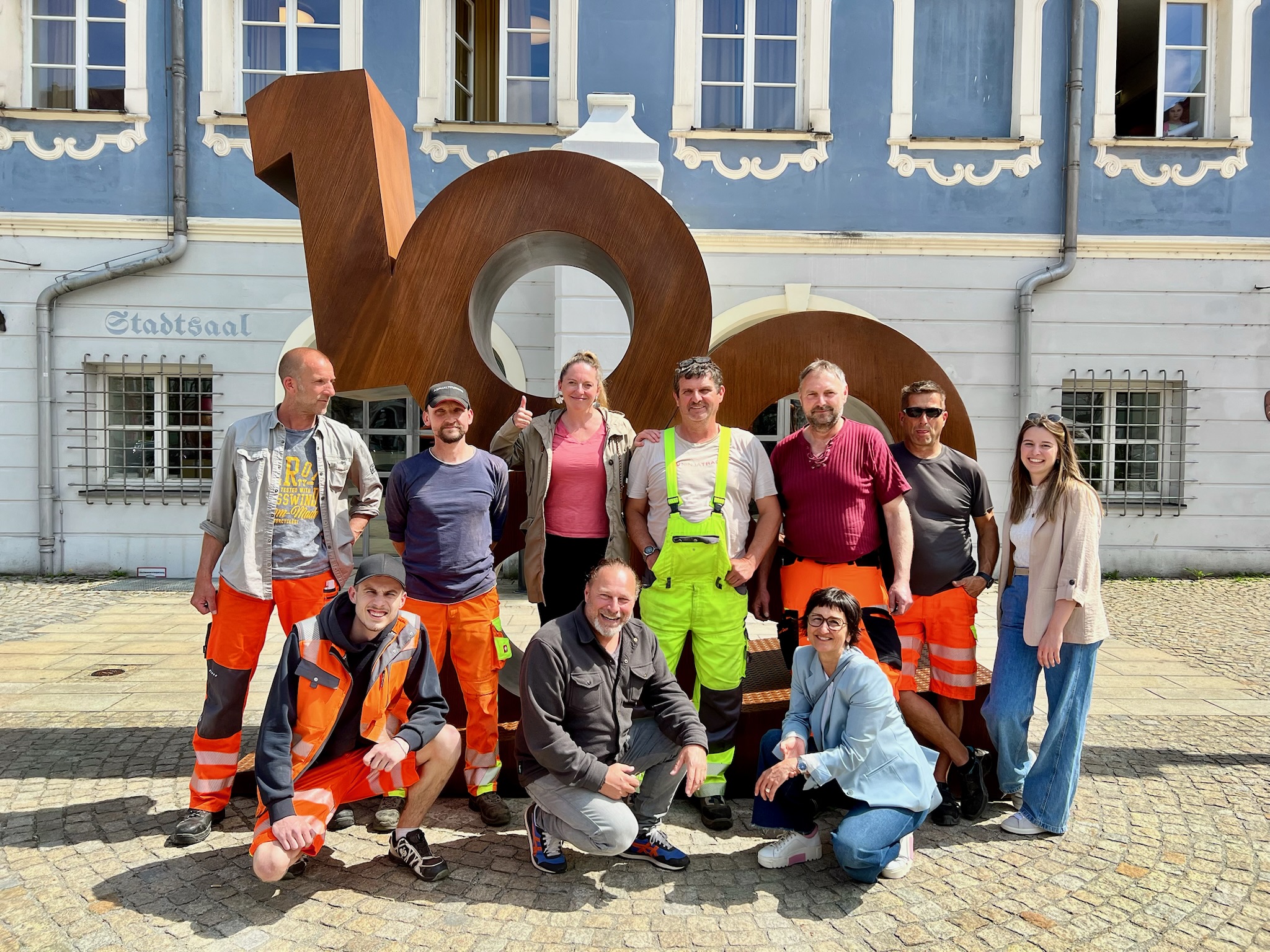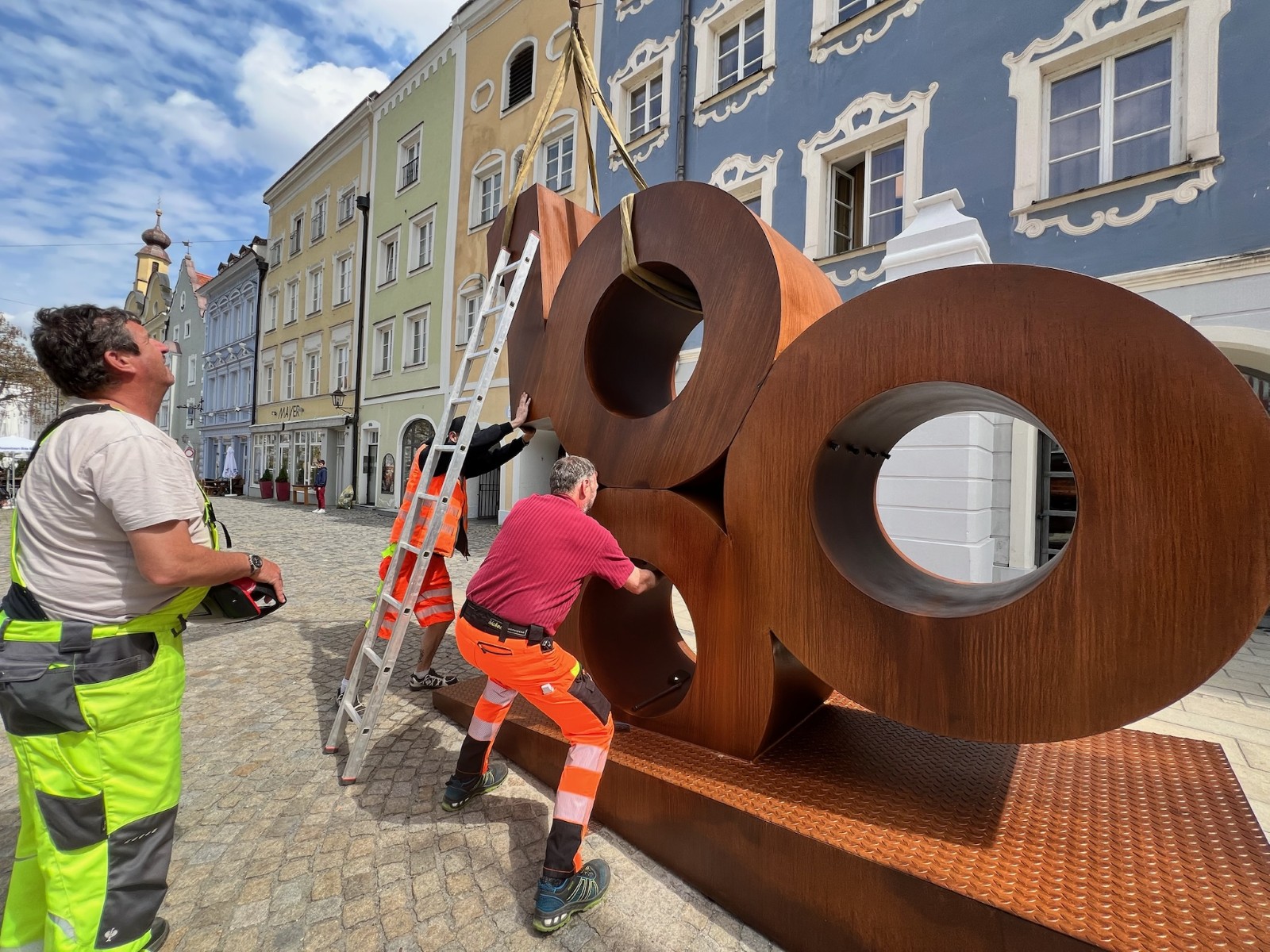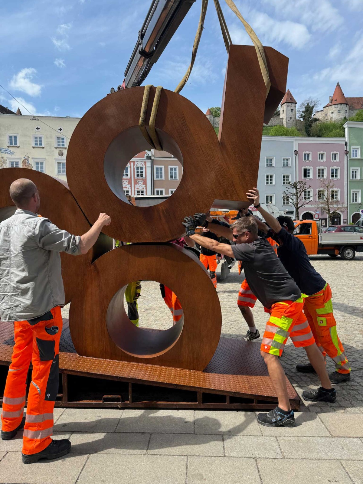 Burghausen. Die maßgefertigte Jubiläumsskulptur in Form der Zahl 1000 ist in Burghausen eingetroffen. Pünktlich zum offiziellen Start des Festjahres wurde das rund 700 Kilogramm schwere Kunstwerk aus Stahl in Rostoptik mit Klarlack lackiert nach seiner Fertigung in Mannheim angeliefert. Die Aufstellung auf dem Stadtplatz hat mehrere Stunden gedauert. Die Stadt Burghausen feiert im Jahr 2025 ihre 1000-jährige urkundliche Erwähnung. Dazu findet Ende April ein Festakt für geladene Gäste statt. Dieser symbolisiert den offiziellen Start ins Festjahr.