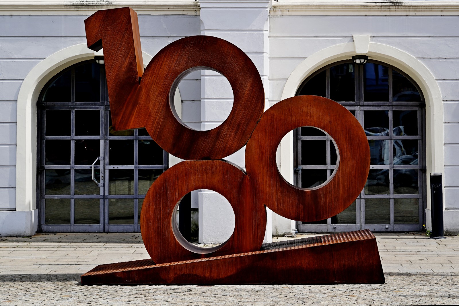 Die Skulptur bietet je nach Perspektive einen eindrucksvollen Blick auf die weltlängste Burg oder das Stadtsaal-Gebäude in königsblau. Ihre Formgebung und Konstruktion wurden auf Langlebigkeit und Stabilität ausgelegt – die drei Nullen sind fest verschraubt und verschweißt.